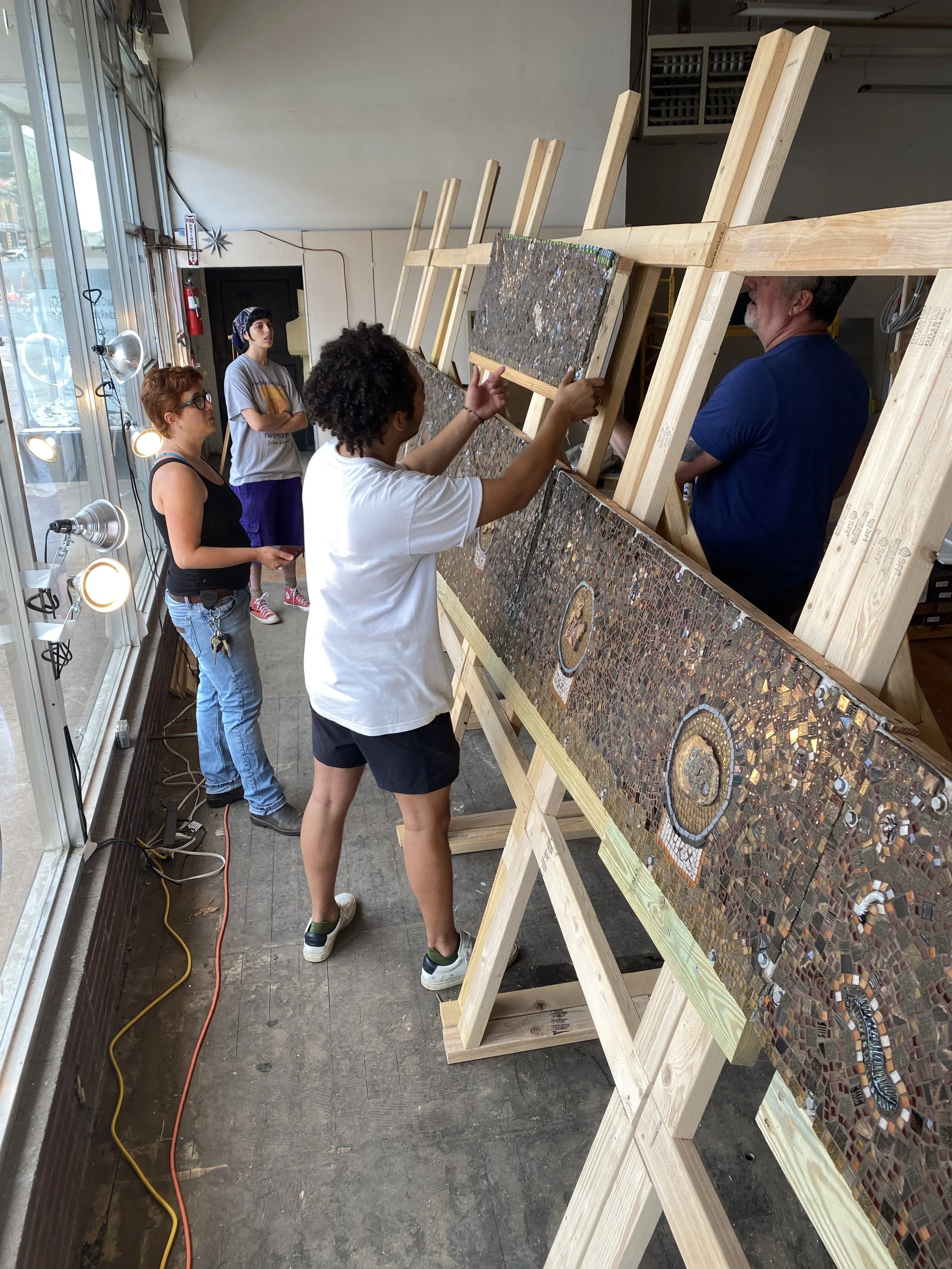 Jamie Hulley Arts Foundation 2025 summer interns Coline McEachern and Matt Aljian work on text tiles for the Beman Family Legacy series. Coline and Matt were also critical in the creation of the TunnelVision website.