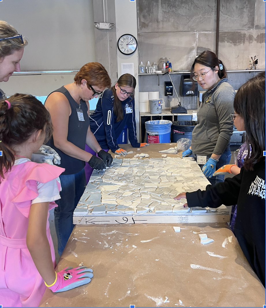 Kate Ten Eyck works with Kids in Science Camp to complete the glacier mosaic.