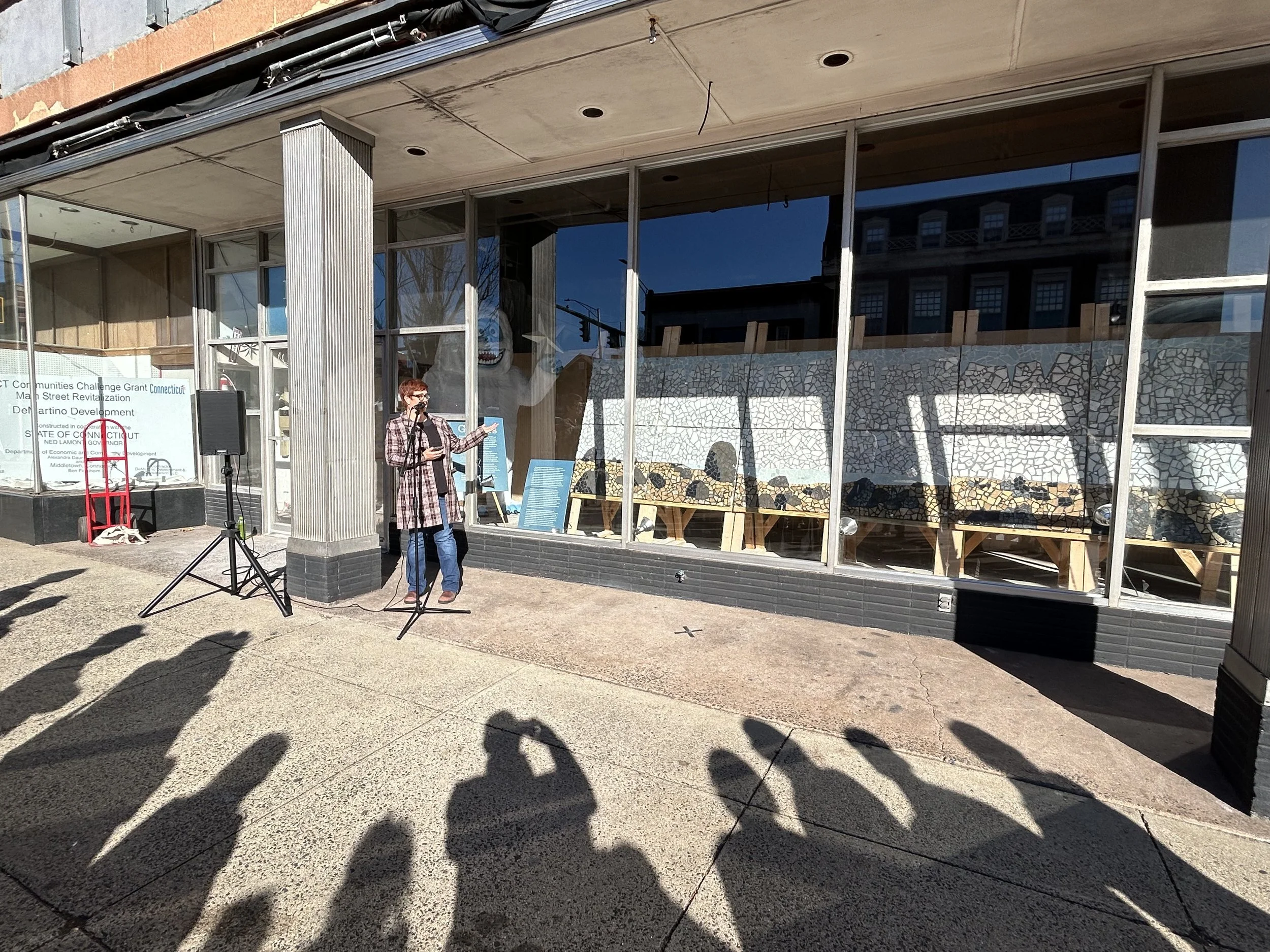 Kate Ten Eyck speaks at the celebration for "Glaciers" as part of Mosaics on Main.